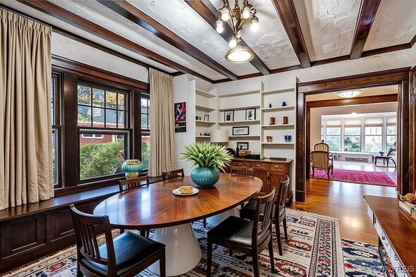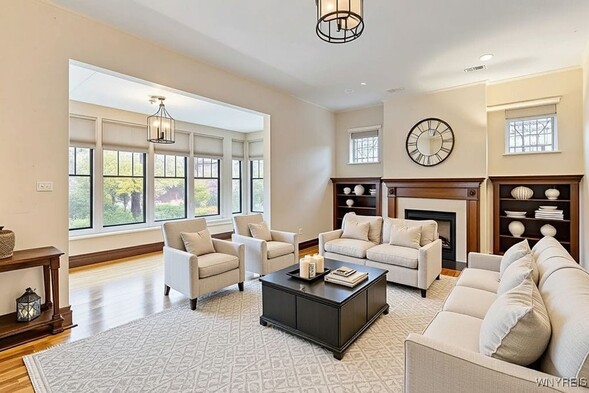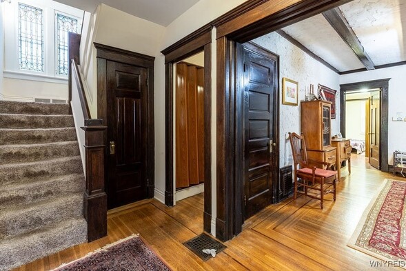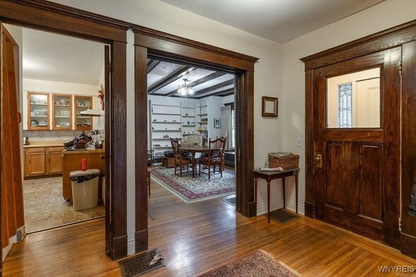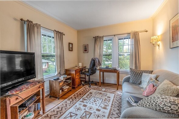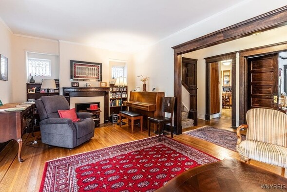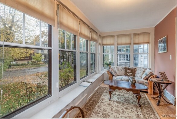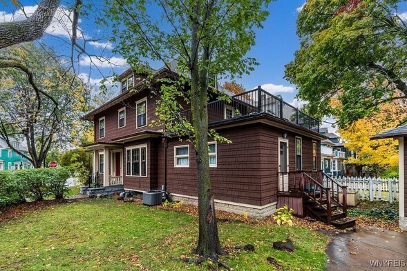 Outstanding side entrance colonial w/year-round sun room. Home features all-natural woodwork throughout, hardwood floors, generous room sizes, formal living room opens to sun room. Outstanding dining room w/coffered ceiling & bookcases, charming eat in kitchen. 1St floor bedroom w/full bath has private entrance could be in-law suite. Beautiful staircase w/leaded glass window leading to 3 spacious bedrooms w/ample closets. 1 bedroom w/French doors to porch w/rout iron railings. 3rd floor has 2 finished spaces could be bonus room, man cave, bedrooms or family room. The home is filled with charm & elegance. Mechanics roof, furnace, AC, whole house generator the past 10 years. Dry basement w/glass block windows, updated electrical. Walking distance to Delaware Park & Buffalo Zoo. Home faces Florence.