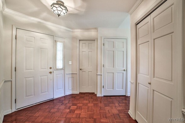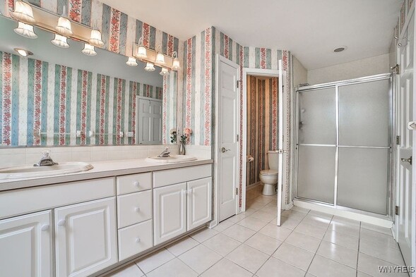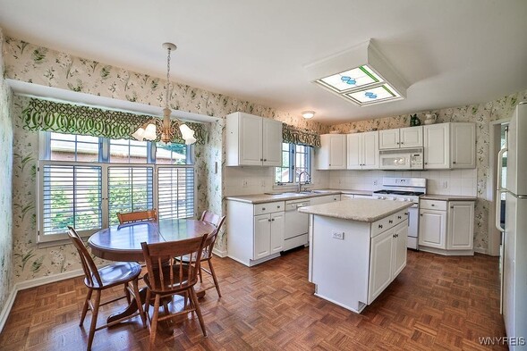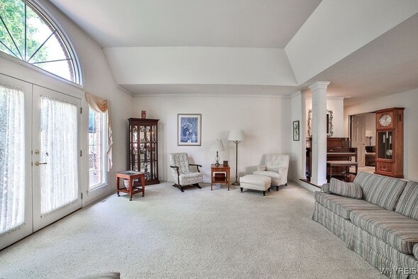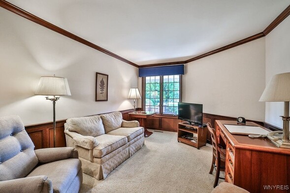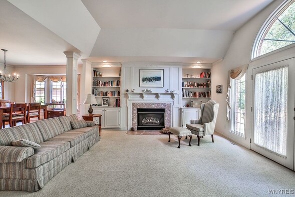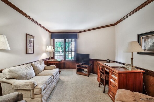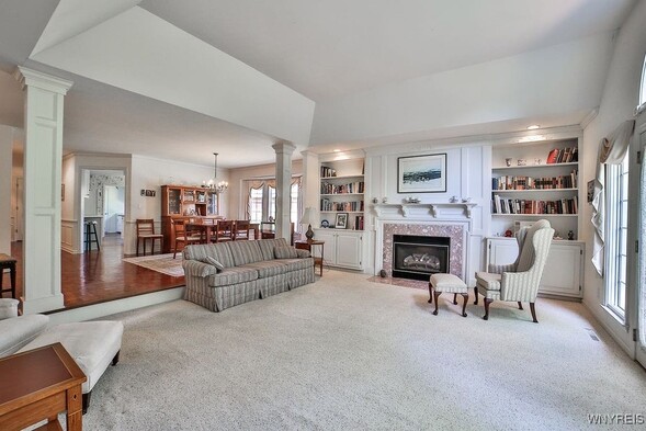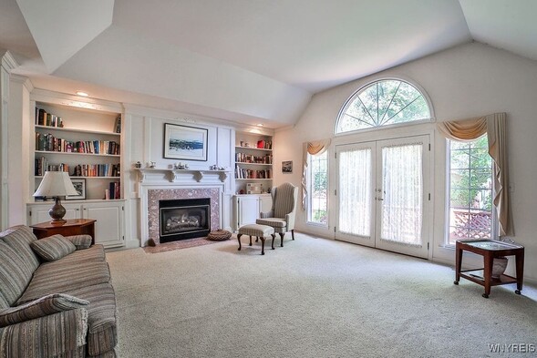 Stunning Williamsville patio home nestled in a quiet cul-de-sac, offering a private wooded lot and a spacious deck with a Kohler awning. The white gourmet kitchen comes fully applianced and includes a walk-in pantry and separate laundry room. The primary suite boasts a 16 x 8 spa-like bath with a whirlpool tub, separate shower, and private commode room .The incredible great room features a fireplace framed by built-ins, and the elegant 20-foot dining room is ideal for entertaining. A large library with double built-ins, soaring vaulted ceilings, and an open floor plan enhance the homes charm. Additional highlights include 2.5 baths, a finished lower and so much more