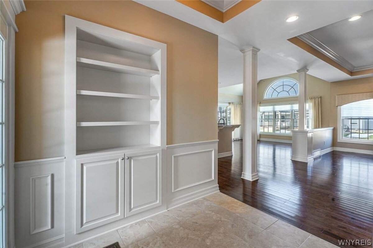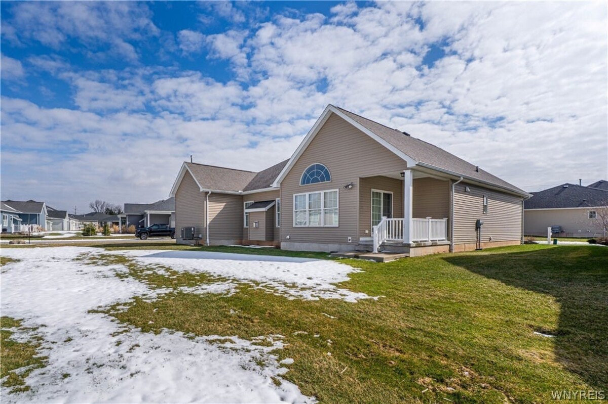 Welcome to this exceptional single-family patio home located in the highly desirable Essex Greens at Waterford subdivision in the heart of Clarence. This beautifully designed residence features 2 spacious bedrooms, 2 full bathrooms, and a versatile private library that can easily serve as a third bedroom or home office. The open-concept floor plan is enhanced by soaring vaulted ceilings, creating a bright and airy living space perfect for both relaxing and entertaining. The stunning white kitchen is equipped with stainless steel appliances, granite countertops, and ample cabinetry, seamlessly flowing into the main living area. Elegant hardwood floors add warmth and sophistication throughout the home. Step outside to enjoy your private backyard oasis, complete with a charming patio and a full sprinkler system to maintain the lush surroundings with ease. The lower level offers impressive 8-foot ceilings, providing excellent potential for additional living space, storage, or future finishing. This home combines comfort, style, and convenience in one of Clarences most sought-after communitiesan incredible opportunity you wont want to miss!