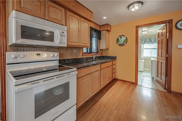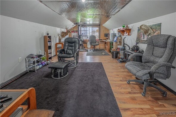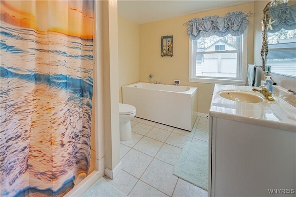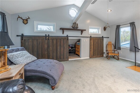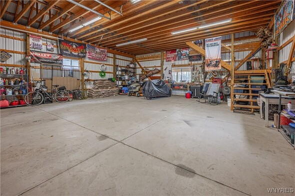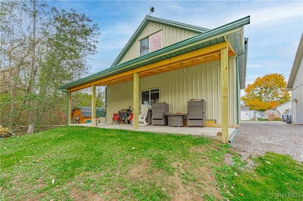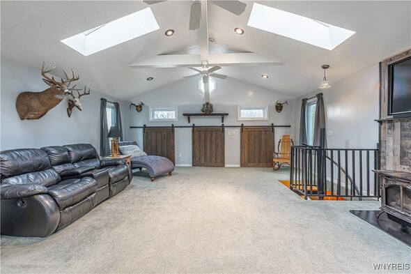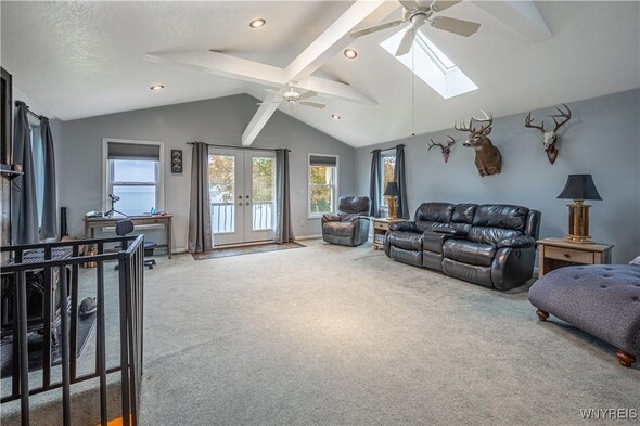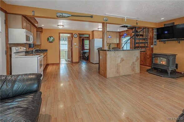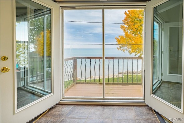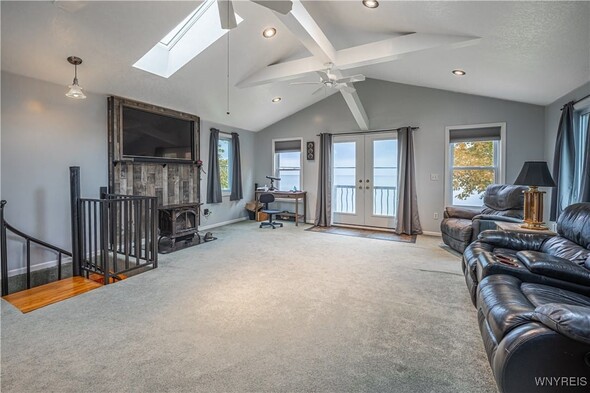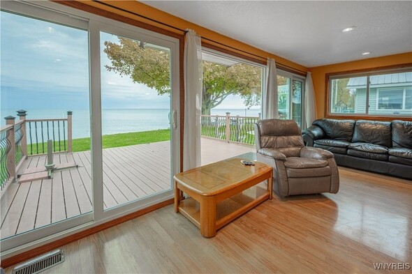 Discover an exceptional Lake Ontario opportunity at an amazing price on a private road! This incredible, year round, 2-bedroom, 1-bath property combines peaceful waterfront living with an open floor plan on each level, designed to capture panoramic lake views and breezes. Feel the tranquility come over you entering the integrated kitchen and living room design featuring your endless lake views from sun up to sundown. The fully applianced kitchen, island dining bar, pellet stove and spiral staircase to the second level of grand space; perfect for a family room or bedroom suite with cozy propane stove, skylights and private balcony will inspire you. First floor bedroom and bath are complete with jetted tub for relaxation needs. Full perimeter, block foundation houses the laundry and home's mechanics. The outside is just as impressive with the expansive, maintenance free deck, break wall protected private shoreline and ample space for entertaining or launching watercraft. A 30 X 32 barn / garage with electricity, concrete driveway and rear covered patio add tremendous value with a partially finished upper level, ideal for a workout room, studio, or guest overflow. Current owner has invested over $75,000 in this must have property. (list attached) Whether youre looking to expand a rental portfolio, create a weekend escape, or enjoy year-round lakeside living, this property delivers comfort, flexibility, and unmatched Lake Ontario scenery. Perfect as a private lakeside home, vacation retreat, or income-producing rental with strong investment appeal!