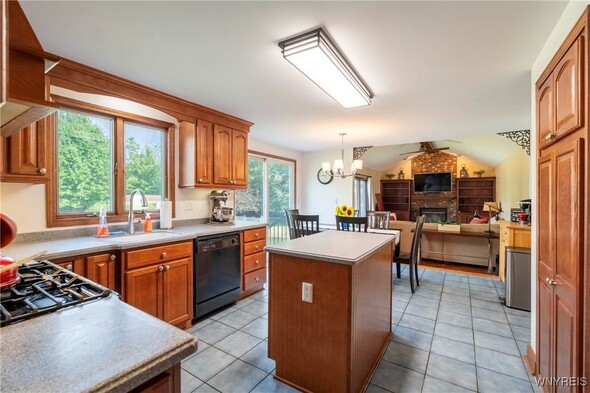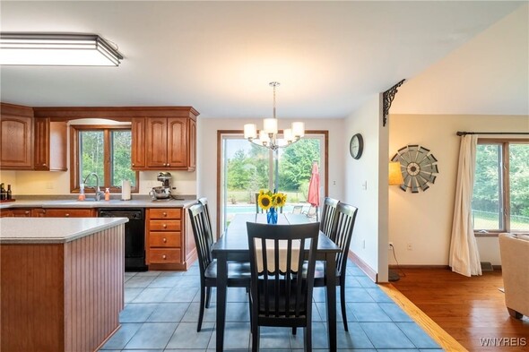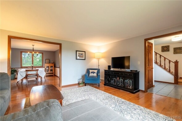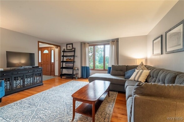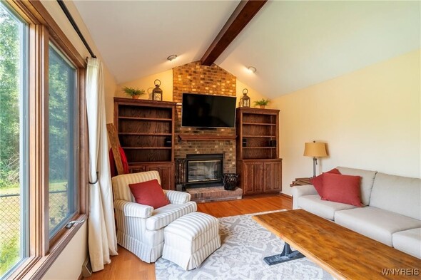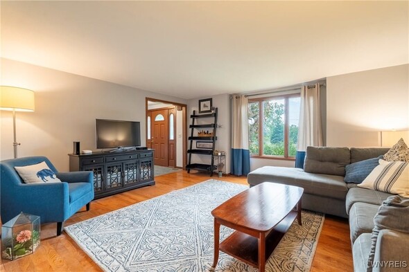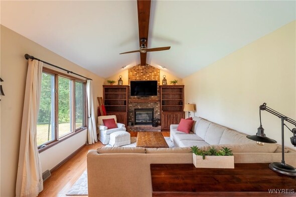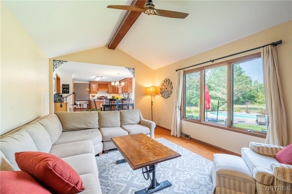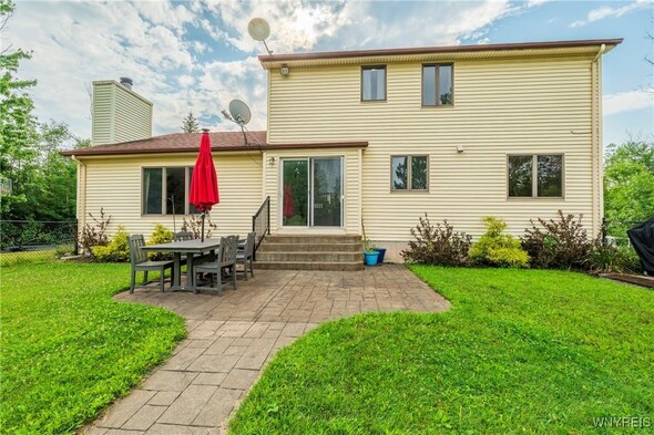 Welcome to your private oasis! Nestled back from the road and surrounded by a lush screen of mature evergreens, this stunning property offers peace and tranquility on a spacious one-acre lot. Dive into luxury with a beautiful inground gunite pool, perfect for summer relaxation and entertaining. Inside, you'll find hardwood floors in the living and dining rooms, while the family room boasts cathedral ceilings, a cozy wood-burning fireplace, and built-in bookshelves, creating the perfect gathering space.The kitchen features sleek Corian countertops and sliding glass doors that lead to a stamped concrete patio, seamlessly connecting indoor and outdoor living. Enjoy your professionally landscaped backyard, complete with ambient lighting, for evening gatherings. Recent updates include a new blacktop driveway (2020), updated pool pump and filter (2024), and a fresh interior paint job (2017). The furnace was also updated in 2024, ensuring comfort year-round. Plus, a sump pump with a water backup system provides peace of mind during storms. Dont miss this rare opportunity to own a slice of paradise!