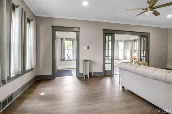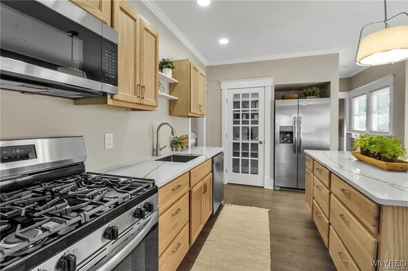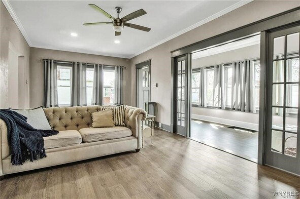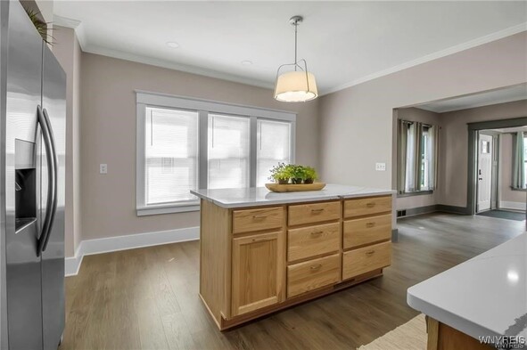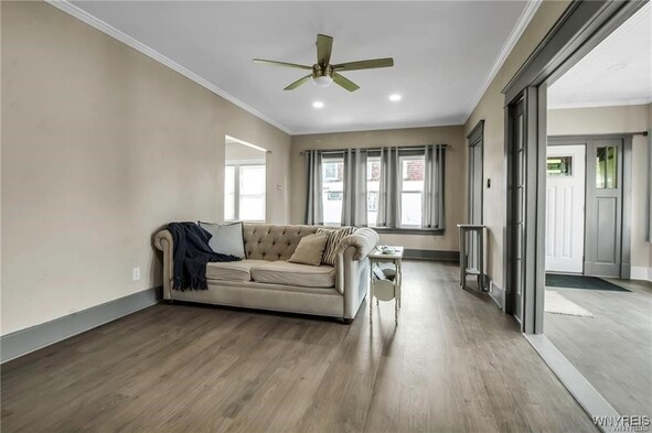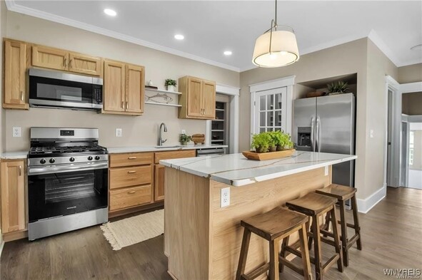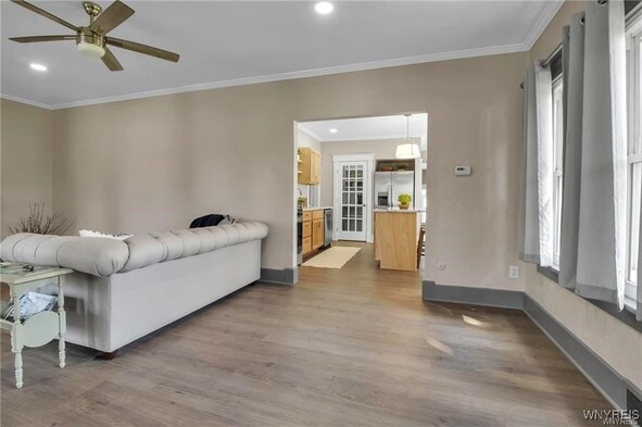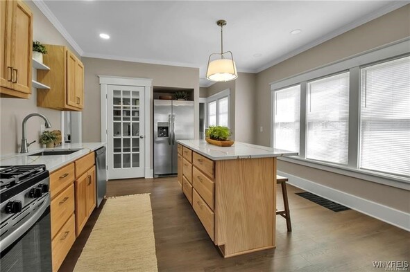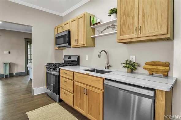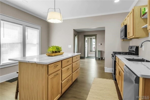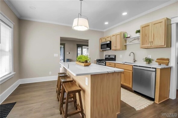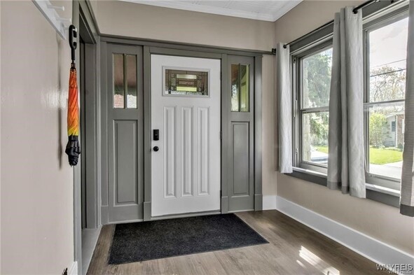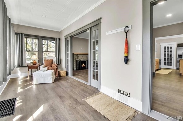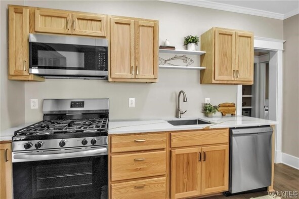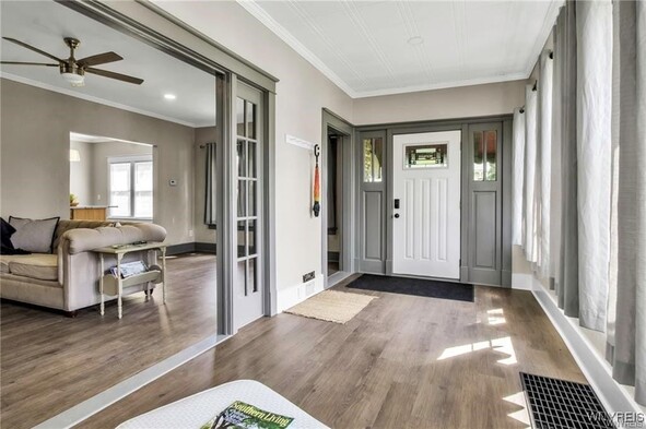 PRICE REDUCTION! OPEN HOUSE SAT AND SUN 11-1, 9/27 AND 28! Just unpack and enjoy living in this totally renovated home on an extra large lot. Approx 1500 sq includes the heated front room and mudroom. Beautiful kitchen with gorgeous veined quartz counters, island and luxury vinyl flooring. Kitchen appliances 2025, SS sink. Quaint walk in pantry with french door.. Crown molding throughout. 2 bedrooms, with 2025 carpeting. Gorgeous bathroom with walk in shower and subway tile and slate floor. FF laundry room, washer, dryer and cabinet included. Most windows replaced, freshly painted throughout. Raised washing station in basement, great for wine making, washing your produce, washing your dog, etc. Furnace 2020, roof 2023 (tear off), Electric panel and connection to street updated to 150 amps, 120/240 volt. An additional bedroom and/or closet/storage space is easily added in the basement as egress windows are already there Great house!