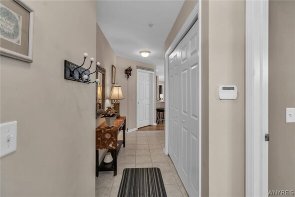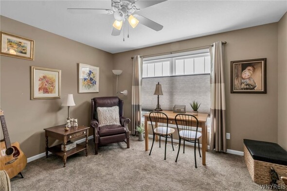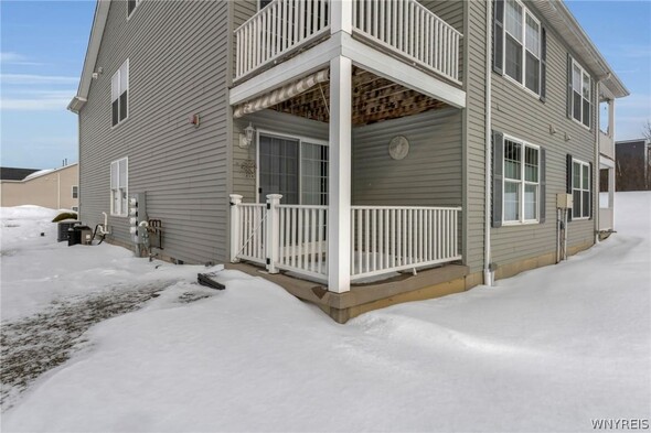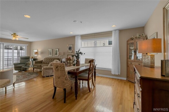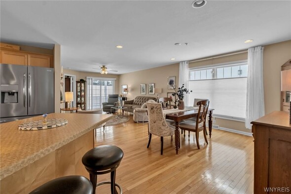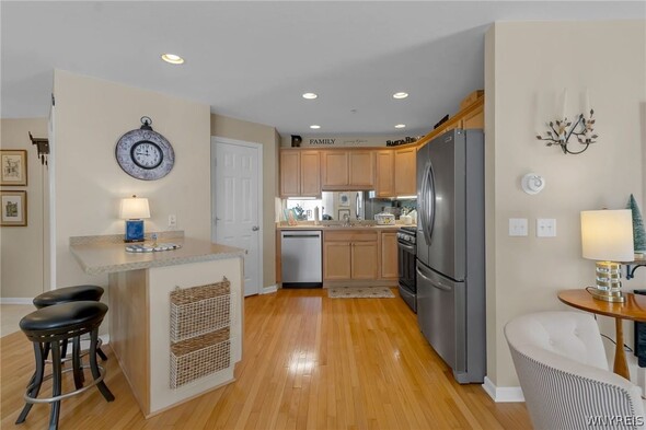 Gleaming first floor unit with first floor laundry. Wonderful open floor plan condo in the Berkley development. 2 Bedroom, 2 full bath. Kitchen has under cupboard lighting, walk-in pantry, fully applianced, and peninsula. Opens to formal dining room and living room with electric fireplace. Hardwood floors in kitchen, dining room and living room. Primary bedroom has his and hers closets, full bath with walk in shower, linen closet and tile floor. Sliding glass doors in living room open to deck with gate to backyard with berm for privacy. Newer bottom up, top down blinds. Washer and dryer included. Full dry basement with workshop area. Kitchen appliances are 4 y.o., furnace and HWT have been updated also. HOA includes Fountain Park.