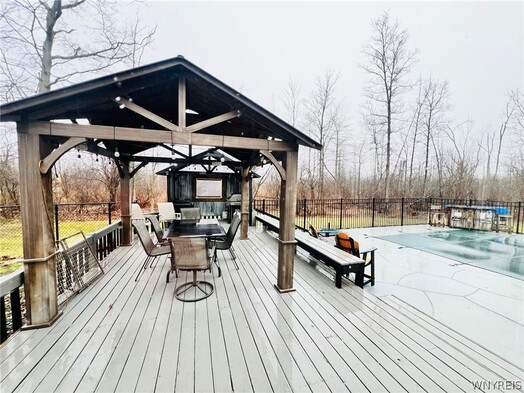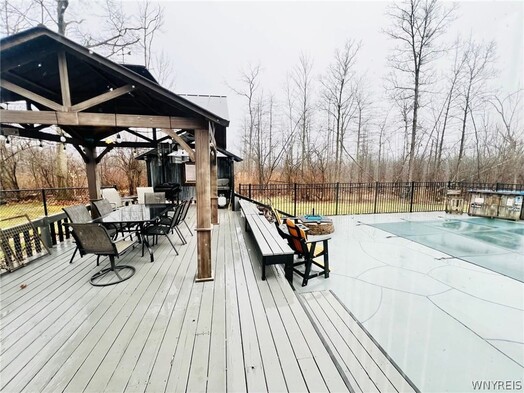 A little slice of Paradise! Fabulous 1.7 acres that is in a private wooded setting. Lovely 4 bedroom, 2 1/2 bath, 2100 square foot Colonial! Spacious fully applianced remodeled eat-in kitchen with island, granite countertops and luxury vinyl flooring. Formal LR/Dining Room combo. Large family room with built in bookshelves and cozy wood burning fireplace. Generous size foyer, primary bedroom with walk-in closet and full bath with double sinks! 2nd Full bath has entrance to second bedroom! All great room sizes! Partially finished basement with 8 foot ceilings and newer glass block windows. 2 Car attached garage. YOU WILL LOVE the heated 3 season room with dry bar and gas fireplace. Awesome entrance to deck, charming gazebo, gorgeous heated inground pool with liner replaced in 2020. Stamped concrete patio surrounds pool! Enjoy your six person hot tub that is new in 2024! Black 5 foot aluminum fence was installed in 2024. 30x30 detached heated and insulated garage! An additional 30x30 cold storage garage will be constructed prior to closing - the concrete has already been poured so the current owner will have the project finished for you! Amazing wide driveway, parking area! Very peaceful and private property yet close to all conveniences!