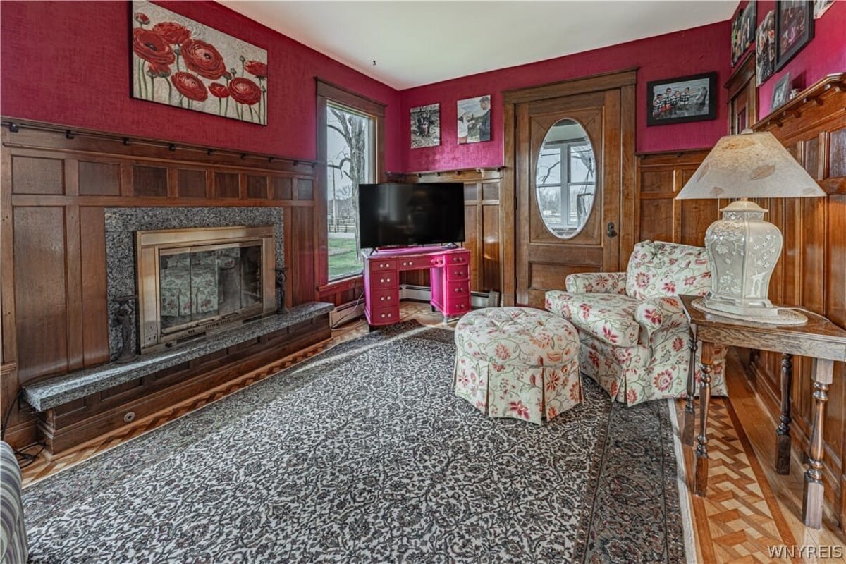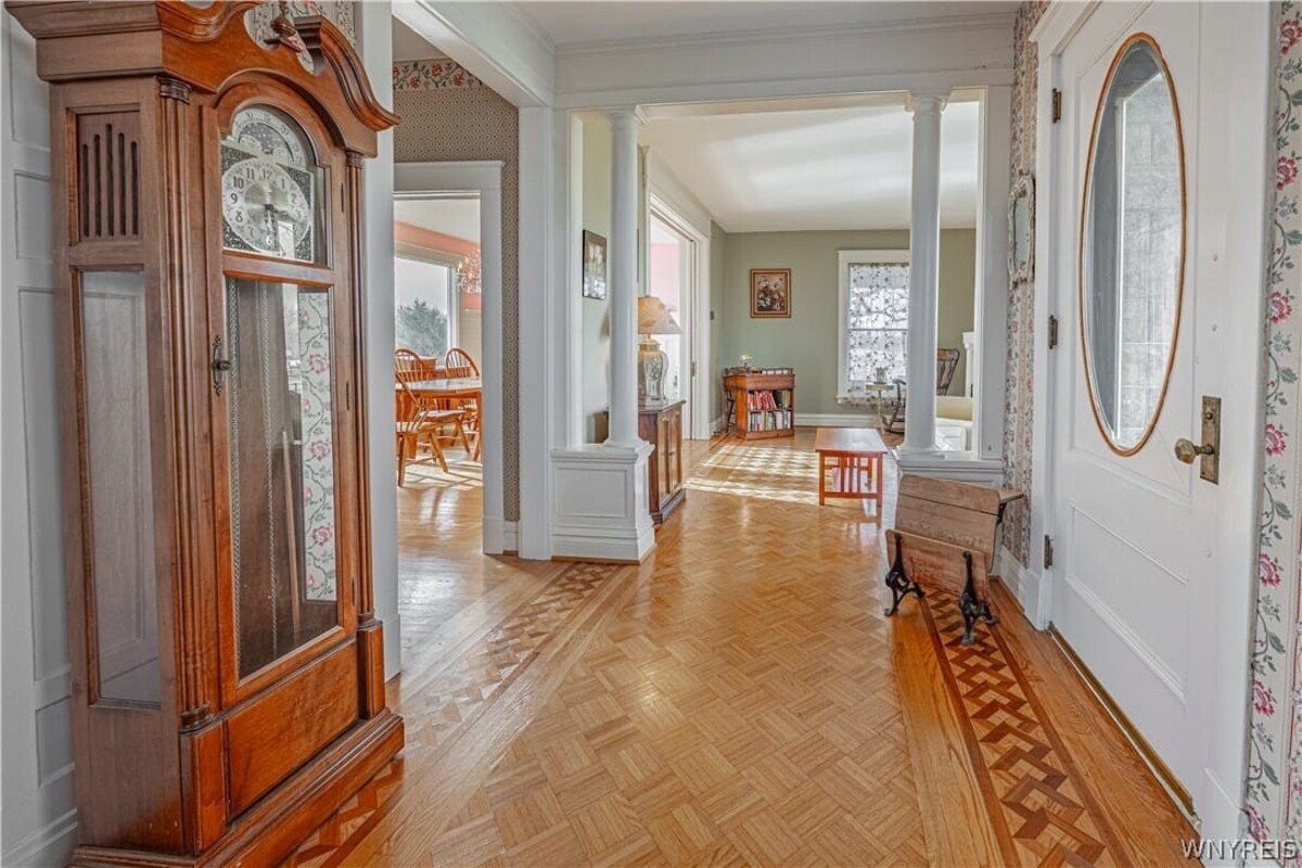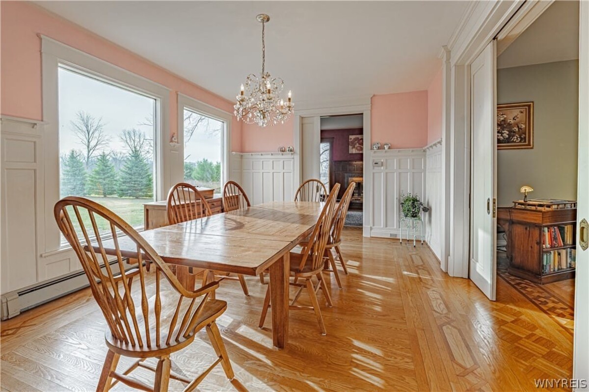 Beautiful and serene! 4.9-acre property featuring a 4/5 bedroom home and extensive outbuildings, including two barns (one equipped with horse stalls) and a separate garage with a woodshed. The main floor offers an open foyer, a living room with a wood-burning fireplace and inlaid hardwoods, a formal dining room, and a family room with a second fireplace. The kitchen includes 2020 granite countertops & appliances, Butlers Pantry with a beverage fridge. For versatility, a private-entrance in-law suite or office features its own bedroom, full bath, and dedicated climate control with separate electric heat and wall A/C. The second floor contains four large bedrooms and a full bath with double sinks, plus a walk-up attic. Key updates include: Roofs: House (2010, w/ warranty) and metal barn roofs approx (2010); Windows: Amish-installed and glass block basement windows (2011); Mechanicals: Boiler (2011), Hot Water Tank (2022), and a 1000-gallon oil tank.